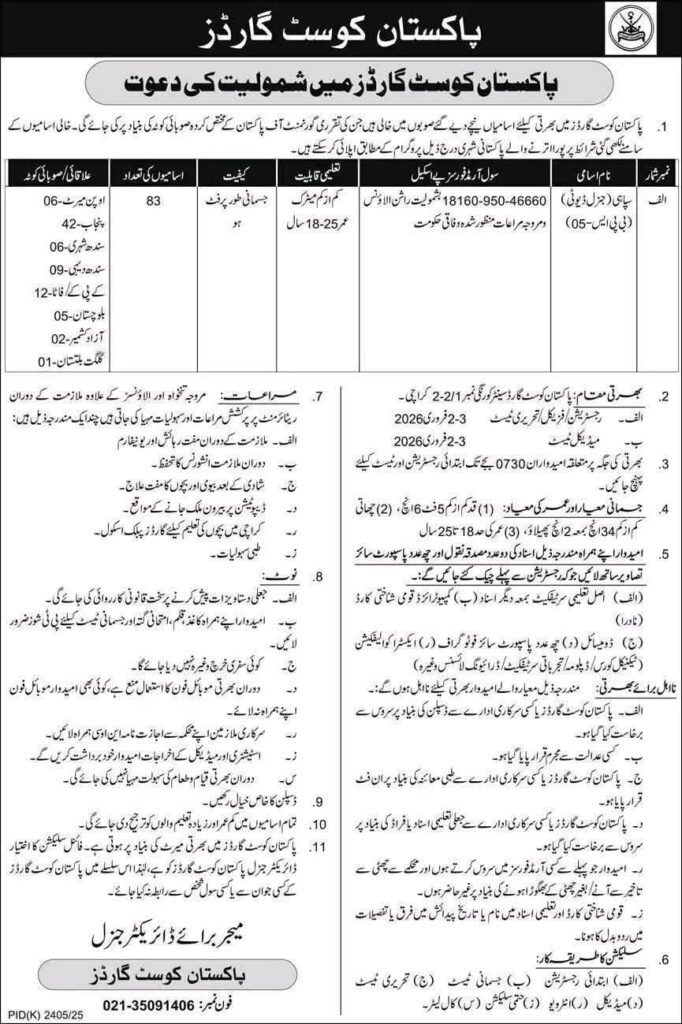Always confirm the latest updates, eligibility conditions, test dates, and recruitment venue details from the original Jang newspaper advertisement or official Pakistan Coast Guards sources.
